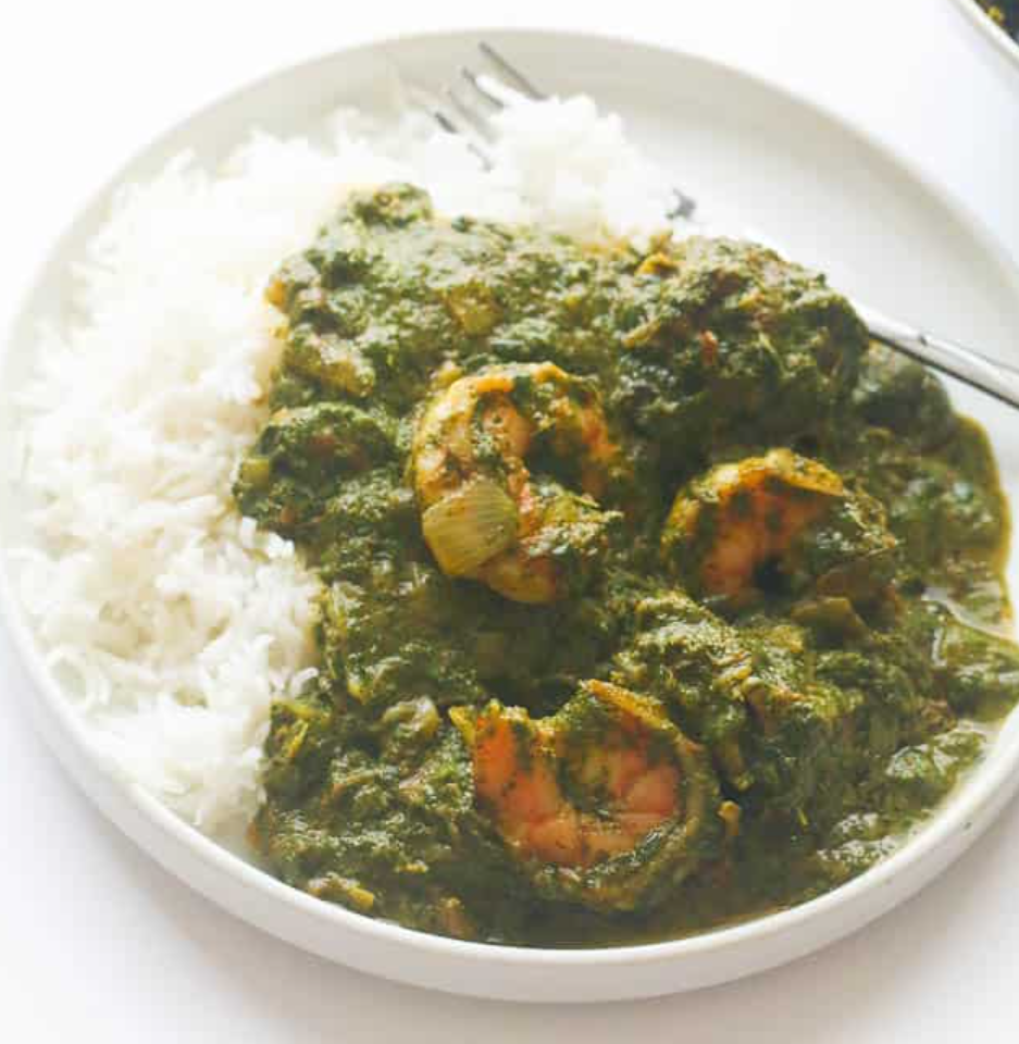 밥과 함께 먹는 카사바 잎 스튜 카사바 잎 스튜는 보통 밥과 함께 먹습니다.